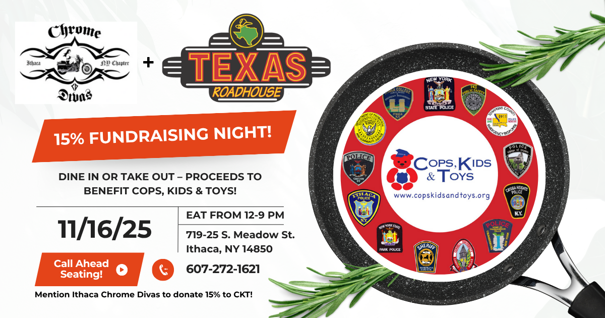 Sunday, November 16, 2025 12 PM – 9 PM Texas Roadhouse 719-25 S Meadow St, Ithaca, NY The Chrome Divas of Ithaca, NY are teaming up with Texas Roadhouse for a special 15% Fundraising Night . When you dine in or order takeout and mention the Ithaca Chrome Divas, 15% of your total food and beverage purchas e will be donated to benefit Cops, Kids & Toys . 🎁 Bonus: Bring a new, unwrapped toy to donate and help make the holidays brighter for local children in need. You can also make a monetary gift online here to help us purchase additional toys. Make plans to bring your family and friends — enjoy some delicious food and help us give back to the community this holiday season! 📞 Call Ahead Seating: 607-272-1621 Questions? Contact info@copskidsandtoys.org .